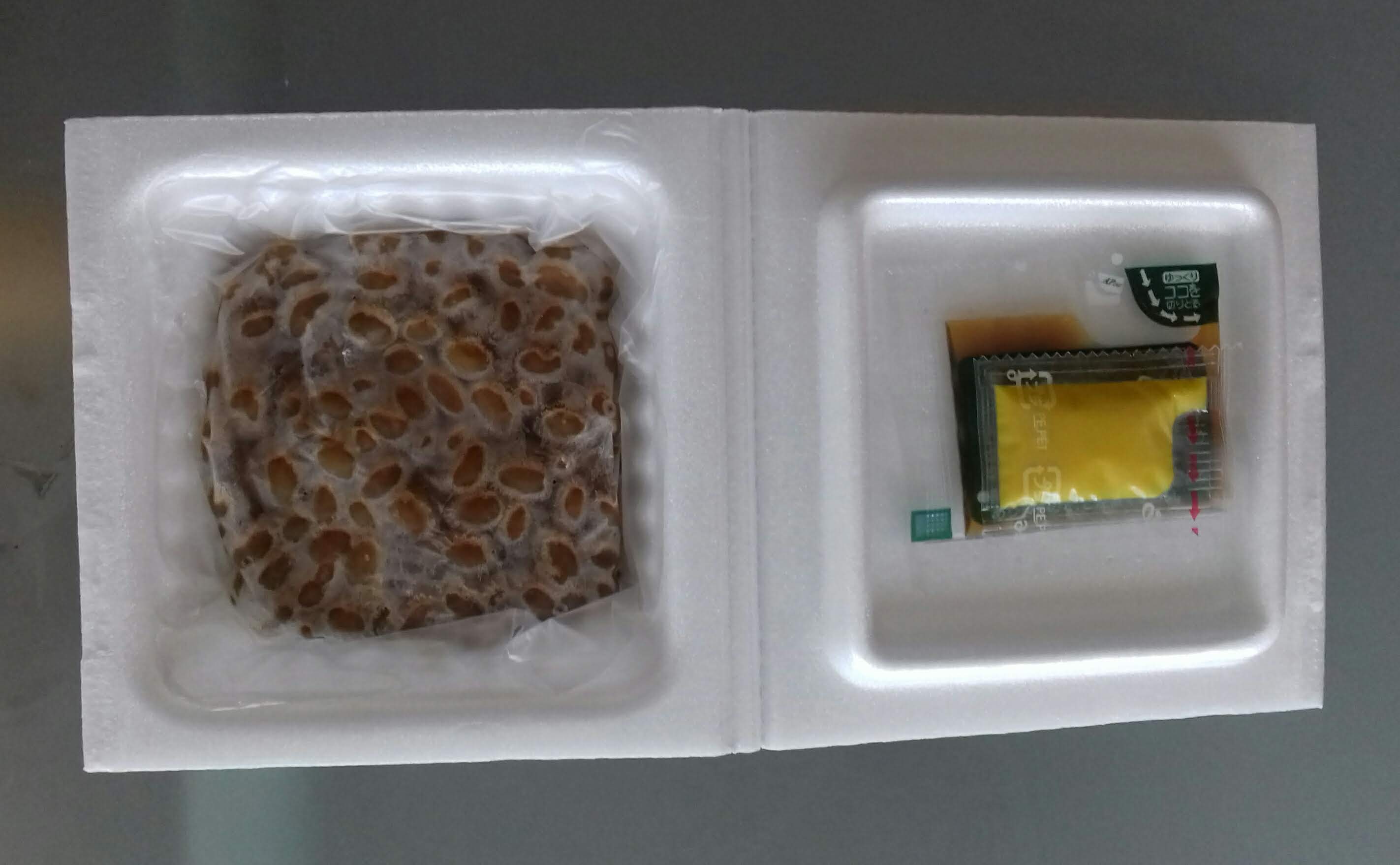 This is called “Natto” Natto (なっとう)is a tradition Japanese food made from soyabeans that have been fermented with Bacillus subtilis var, natto. Japanese often take this at a breakfast. Natto usually comes with Karashi (からし) and soya sauce(しょうゆ). The left hand side is the “Natto” and on the right hand side are yellow mastard (からし) and soya sauce(しょうゆ) 。