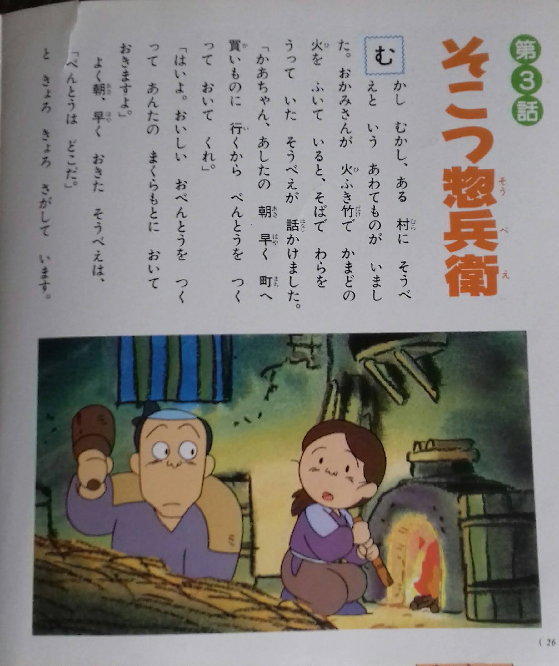 Once upon a time, there was a man called [sonbei] who was a hasty person at a village. When his wife was blowing fire in a kamato (a cooking stove) with a bamboo blowpipe Sobei was punching wara (straw) besides his wife and started talking to his wife.