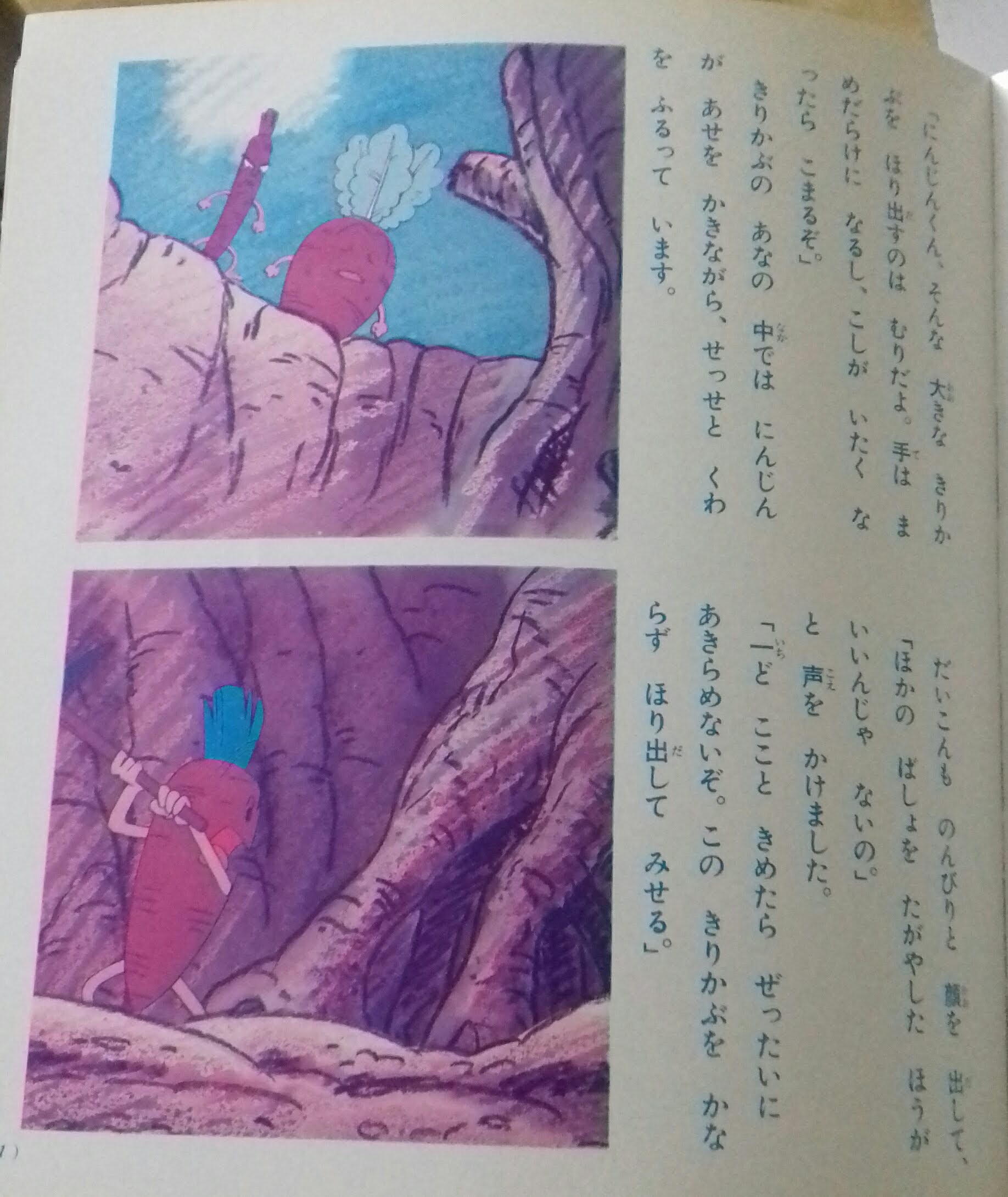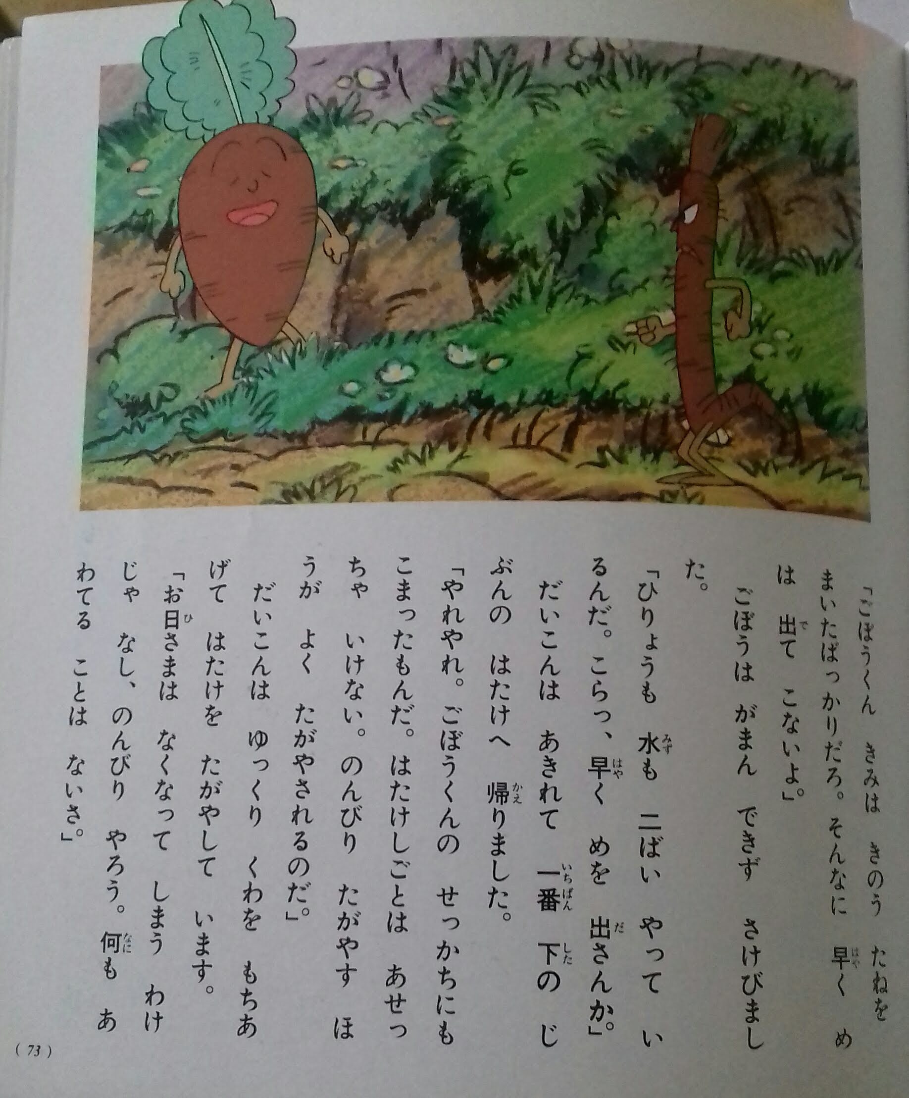 Once upon a time, there were terraced fields. A stubborn carrot and a short-tempered burdock and a easygoing radish were working together on the fields. Three of them were covered with mud every day.