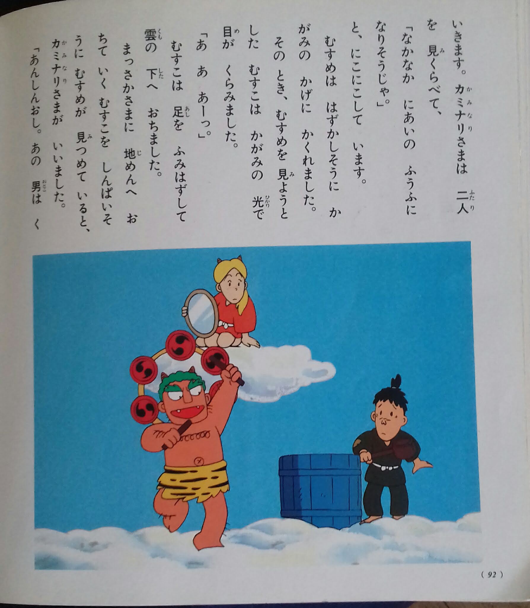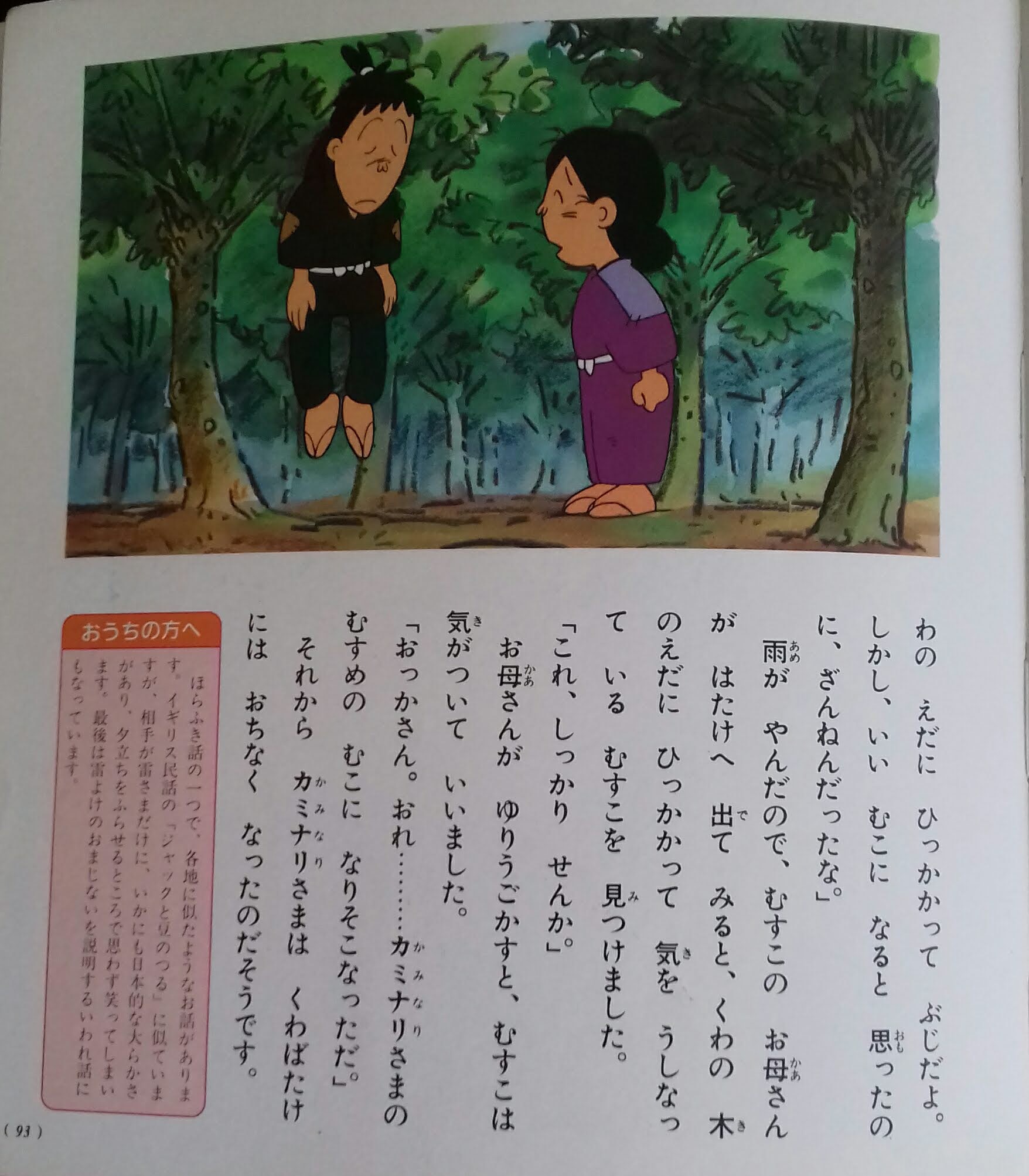 This is one of the fabricated stories, there are many similar stories at various regions. The story is similar to ” Jack and the Beanstalk” English story. But instead a giant Kaminari san (The thunder man ) appears in this story. The funny part is to make evening shower occurs.