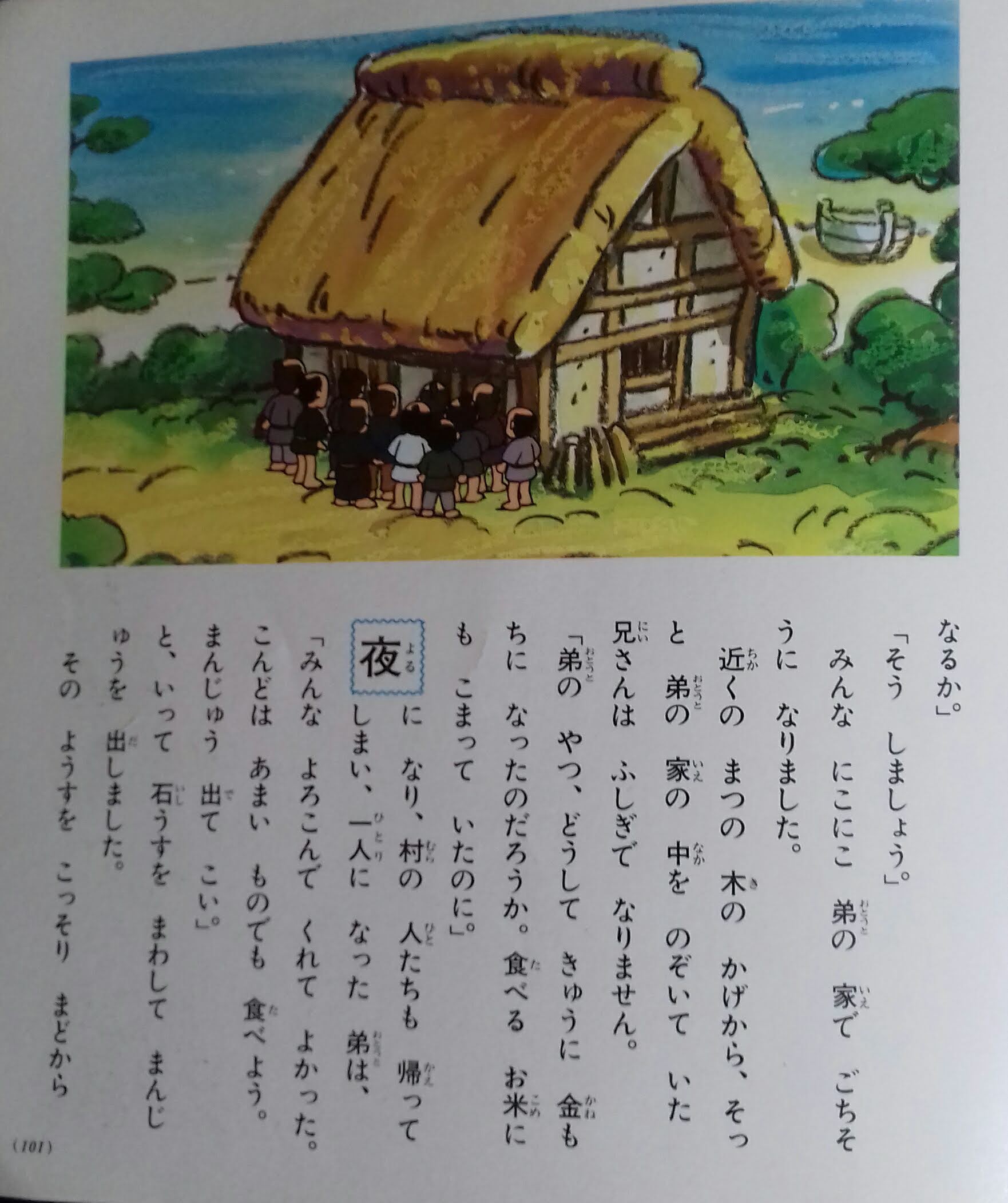 The elder brother, who were peeping the younger brother’s house from the shadow of the pine tree near by, is puzzled.
