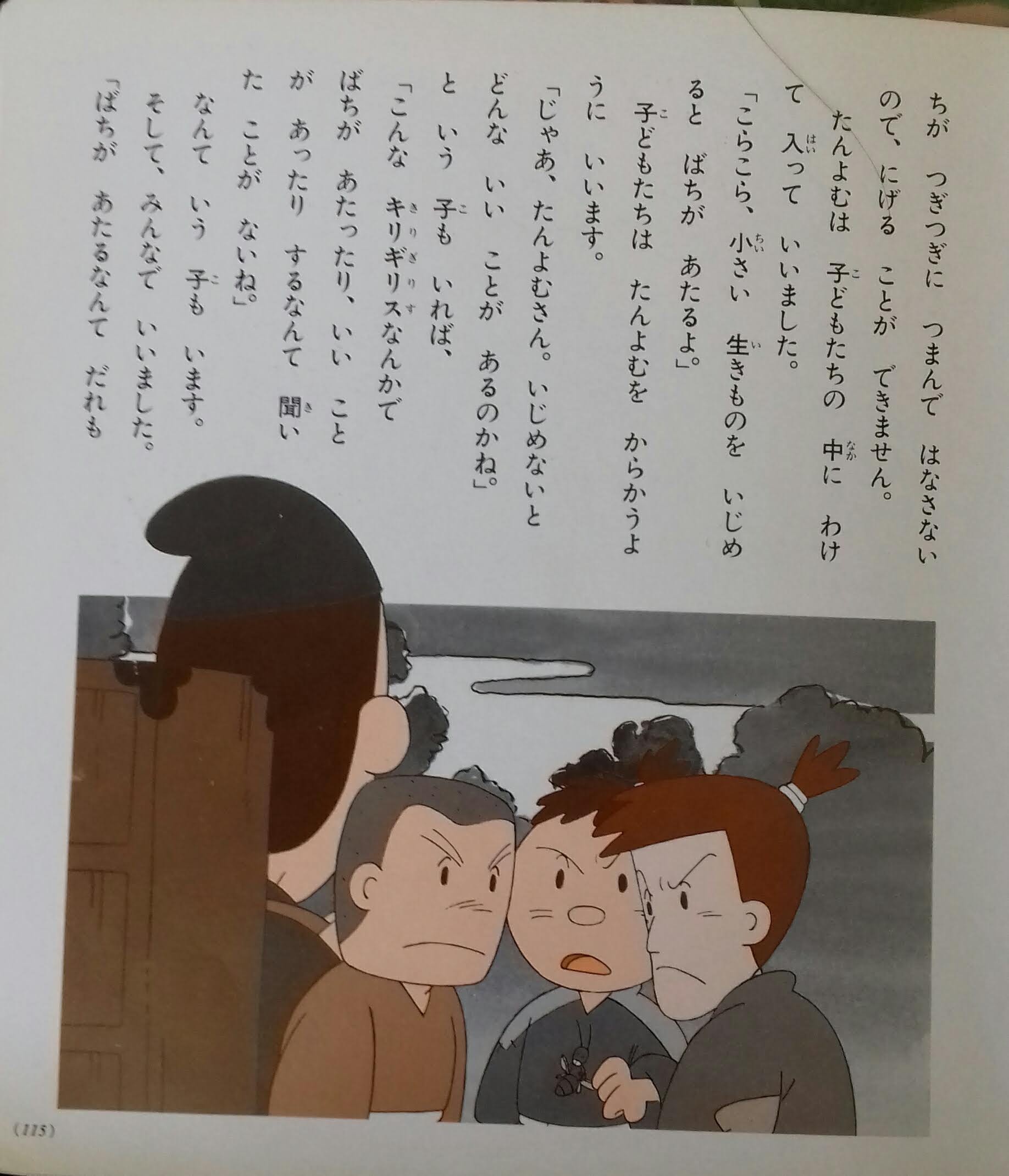 When Tanyomu closed to them children were catching a grasshopper and forcing him to cry.