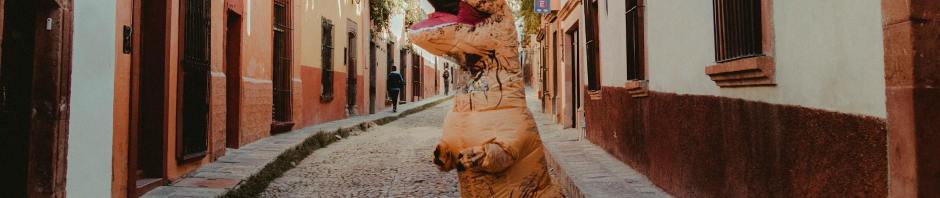 A team of families participated it. One of the team wore a dinosaur’s costume which has short arms and lets. They were kicking a ball, running and were doing their best even in they fell down.